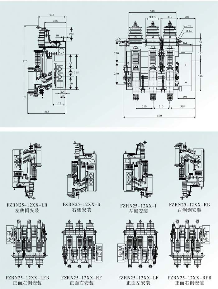 FZRN25-12型真空負荷開關和FZRN25-12型組合電器、總體結構采用操作機構布置于主回路側面的形式。(可根據用戶需求提供主回路右、左側面或正面的形式)。主導電部分由絕緣罩、靜觸頭、活門、導電筒、真空滅弧室等構成,組合電器還有限流熔斷器。
