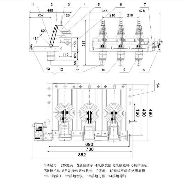 單斷點(diǎn),三工位結(jié)構(gòu)確保隔離開(kāi)關(guān)合閘時(shí)不能接地,接地時(shí)不能合閘。