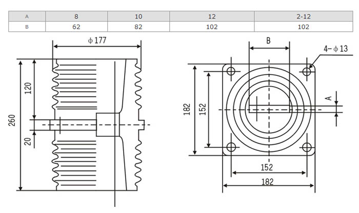 TG2-10Q套管為環(huán)氧樹脂APG工藝壓力凝膠成型結(jié)構(gòu),外形結(jié)構(gòu)尺寸大小為128(100×100)mm、高225mm。主要適用于額定電壓為10KV及以下的成套設(shè)備中,作絕緣隔離和聯(lián)接過(guò)度之用。套管耐污及潮濕,無(wú)需特別維護(hù),只需定期地清理表面污質(zhì)。安裝時(shí)母排從孔內(nèi)穿過(guò)。